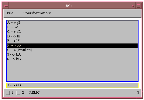 The Regular Grammar window allows the entry and manipulation of regular grammars. The window is split into two main parts - a text field from which the user may enter rules and a list box showing the currently input rules.